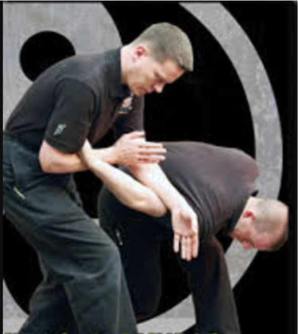 We now know what the ‘needle’ is, but what about the martial application of this movement? There are many different interpretations of Needle at Sea Bottom (as there are with all Tai Chi postures). Many people interpret the fingers of the right hand as attacking an opponent who has been flung to the ground. When we look at the 13 Energies, however, the Needle at Sea Bottom is shown as a plucking energy. In this case, then, our opponent has grabbed our right wrist (or, he has thrown a punch), we then pull him down, using the left hand to release his grip and then finish as an arm bar takedown (as shown in the image below) Although Needle at Sea Bottom is completed on one side only in the Beijing 24, it is a good idea to practice it on both sides, to develop coordination, strength and balance. In the image below, from Clear Martial Arts the application of Needle at Sea Bottom is clearly shown.